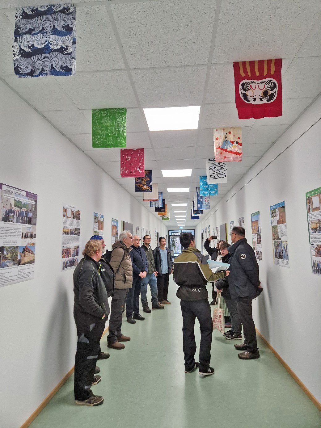 Am Montag 26.01.2026 wurde im Rahmen einer kleinen Feierstunde an der HFR die Ausstellung mit den japanisch-deutschen Postern durch Herrn Prof. Dr. Dr. h.c. Bastian KAISER eröffnet. Zugegen war eine Delegation der Präfektur Gifu und japanischen Unternehmen des Holzhandels bzw. Möbelbaus. Professor KAISER äußerte sich wie schon zuvor beeindruckt von den vielen Persönlichkeiten und Studierenden, die im Laufe der Jahre in Begegnung, kulturellen vor allem aber fachlichen Austausch gekommen sind: „Mich freut ganz besonders, dass es sich bei den gegenseitigen Besuchen nicht um kurze, für die Teilnehmenden einmalige Begegnungen handelt, sondern sich daraus eine tragfähige, belastbare und erfolgreiche Zusammenarbeit zwischen den Institutionen und zwischen der Personen längst auch Begegnungen zwischen Freunden geworden sind“.