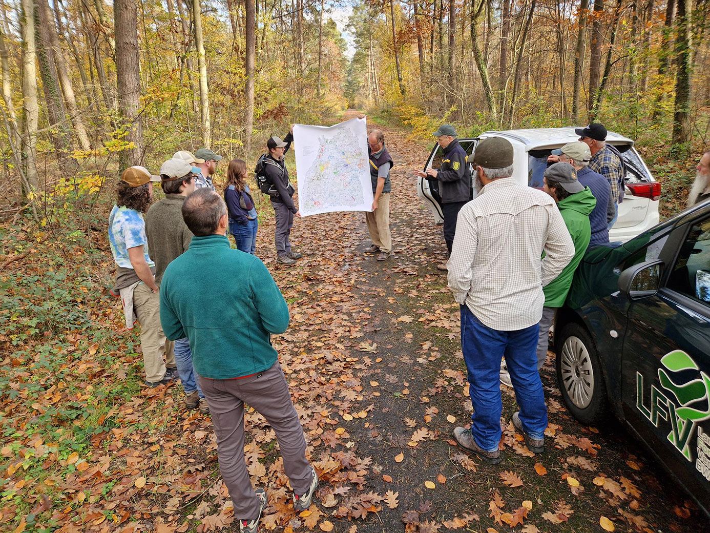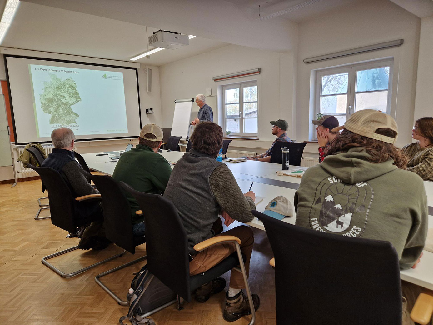 Natürlich wollten sich die internationalen Gäste auch die Alt-Eichen Bestände im Lehrrevier der Hochschule ansehen, nachdem Prof. Dr. Sebastian Hein einen Impulsvortrag zur „Problematik der Wertholzproduktion im Klimawandel“ gegeben hatte. Prof. Hein freute sich insbesondere über die Begegnung mit Prof. Weiskittel, der einige Erinnerungen aus der gemeinsamem Forschungs- und Publikationszeit in Oregon/Pacific Northwest und Maine/Atlantic-Northeast mitgebracht hatte: „Das Beste am heutigen Treffen ist, dass diese Kontakte nun den Studierenden beider Hochschulen offen stehen.“ Und Prof. Livingston kommentiere: „Das Programm DAAD-RISE Germany 2026 – Forschungspraktika, bietet einen sehr guten Rahmen für Austausch über alle Studiengänge beider Hochschulen“! Die nächsten konkreten Schritte werden Bewerbungen von Studierenden sein.