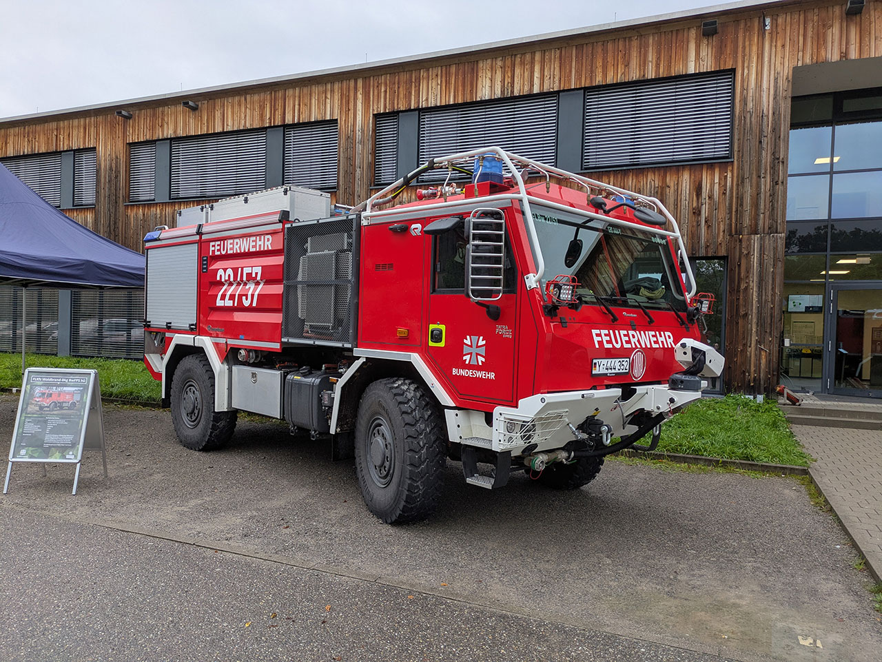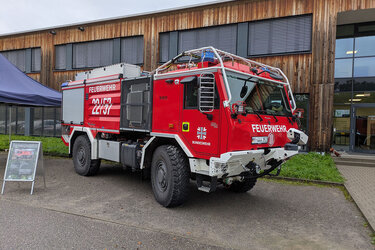 Neben den Vorträgen bot sich für die Präsenzteilnehmer im Rahmenprogramm die Möglichkeit, den Kontrast aus bundesweit verfügbarer Feuerwehrtechnik im Vergleich zu absoluter Spezialtechnik zu besichtigen. So stellte die Feuerwehr Rottenburg ihr neues Tanklöschfahrzeug TLF-3000 in Kombination mit einem Gerätewagen Logistik zur Anschauung zur Verfügung. Beide Fahrzeugtypen verfügen über eine Grundausstattung an Vegetationsbrandequipment, wie Löschrucksäcke, Feuerpatschen und Motorsägen. Diesen Fahrzeugen gegenüber standen die neuesten Tanklöschfahrzeuge Waldbrand (TLF-W) der Bundeswehr aus der Albkaserne in Stetten a.k.M. und der Feuerwehr Stuttgart. Sowohl das Fahrzeug der Bundeswehr auf Basis eines Tatra Fahrgestells, als auch der Unimog aus Stuttgart sind für extremes Gelände und Brandbekämpfung direkt aus dem fahrenden LKW ausgelegt. Beide Fahrzeuge verfügen darüber hinaus beispielsweise über eine Eigenschutzanlage für den Gefahrenfall.