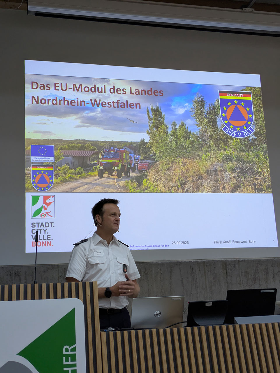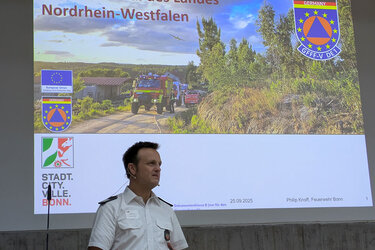 Im Rahmen des Fachforums wurden unterschiedlichste Themen aus den Bereichen Forst und Feuerwehr im Hinblick auf die Prävention und die Bekämpfung von Vegetationsbränden beleuchtet. Zum Auftakt stellte Philip Knoff von der Berufsfeuerwehr Bonn das GFFF-V (Ground Forest Firefighting using Vehicles) Modul des Landes NRW vor. Diese Spezialeinheit wurde im Rahmen des europäischen Katastrophenschutzverfahrens gegründet und kann bei extremen Vegetationsbränden europaweit eingesetzt werden. Mit einem aktuelleren Thema hätte das Fachforum kaum beginnen können, da das GFFF-V Modul gerade erst in Spanien die Bekämpfung zweier Großfeuer unterstützt hatte und Philip Knoff somit Berichte und Informationen über das Einsatzgeschehen aus erster Hand liefern konnte.