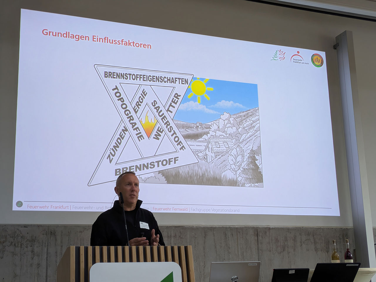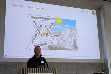 Im zweiten Teil des Fachforums stand zunächst das Thema Einflussfaktoren auf das Vegetationsbrandverhalten im Fokus. Michael Müller von der Branddirektion Frankfurt und Tobias Hennemuth von der Feuerwehr Fernwald erläuterten dabei, wie Wetter und Topographie, aber auch Brennmaterial und weitere Faktoren das Ausbreitungsverhalten und die Intensität eines Feuers beeinflussen. Dabei konnten sie zeigen, wie wichtig die Kenntnis dieser Faktoren ist, um eine geeignete und sichere Einsatztaktik wählen zu können.