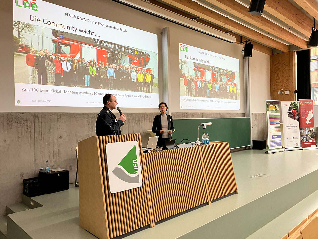 Bereits heute deuten die Zahlen darauf hin, dass 2025 auf europäischer Ebene ein besonders starkes Waldbrandjahr wird und auch Deutschland eine Vielzahl an Waldbränden zu verzeichnen hat. Unweigerlich rückt das Thema Wald- bzw. Vegetationsbrand daher sowohl bei Feuerwehren als auch auf Seiten des Forstes immer stärker in den Fokus. Vor diesem Hintergrund veranstaltete das FFFLab (ForestFireFighting Laboratory) der Hochschule für Forstwirtschaft Rottenburg und der Feuerwehr Reutlingen am 25.09.2025 ein großes Fachforum unter dem Titel „Feuer & Wald – Brennende Wälder, drängende Fragen“. Ca. 200 Experten und Interessierte nahmen an der Veranstaltung teil, entweder vor Ort in Rottenburg oder online am Bildschirm. Die Teilnehmer kamen dabei aus dem gesamten Bundesgebiet bis hin zu angrenzenden Ländern wie Österreich und Belgien.