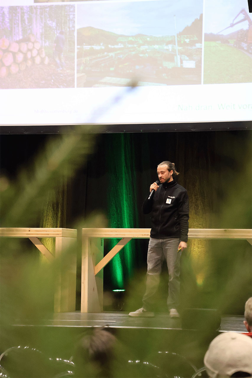 Ein besonderes Highlight fand zudem am Sonntagnachmittag statt. Hier wurden die Studiengänge Holzwirtschaft, Ressourceneffizientes Bauen sowie Erneuerbare Energien im Rahmen der Vortragsreihe „Berufsbilder im Cluster Wald, Holz, Klima“ durch die Studierenden Luis Schöller und Valentin Ruppert auf der Hauptbühne der Edeka Halle vorgestellt. Beide stellten die fachliche und gesellschaftliche Relevanz der Studiengänge vor und ergänzten diese um persönliche Eindrücke und Erfahrungen aus ihrem Studienalltag. Beide hoben besonders die praxisorientierte Lehre mit den vielen Lehrfahrten hervor. Ergänzt wurde der Vortragsslot um einen kurzen Einblick in die praxisnahe Forschung der Hochschule durch Luca Kiener.