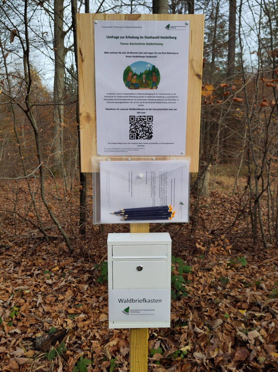 Um möglichst viele Rückmeldungen aus der Bevölkerung zu erhalten, setzen die Studierenden auf ein nutzerfreundliches Konzept. Entlang des Weges wurden Befragungsstationen installiert - Holzpfähle mit QR-Codes führen direkt zu einer digitalen Umfrage, während ein Waldbriefkasten die Möglichkeit bietet, handschriftlich ausgefüllte Fragebögen einzureichen. Damit soll die Umfrage allen Waldbesuchenden offenstehen, ohne auf digitale Geräte angewiesen zu sein. Zusätzlich wurden Befragungsbögen in Altenheimen sowie Inklusions- und Betreuungseinrichtungen verteilt. Damit ist nicht nur die Zielgruppe am Weg, sondern auch in der Stadt repräsentiert.