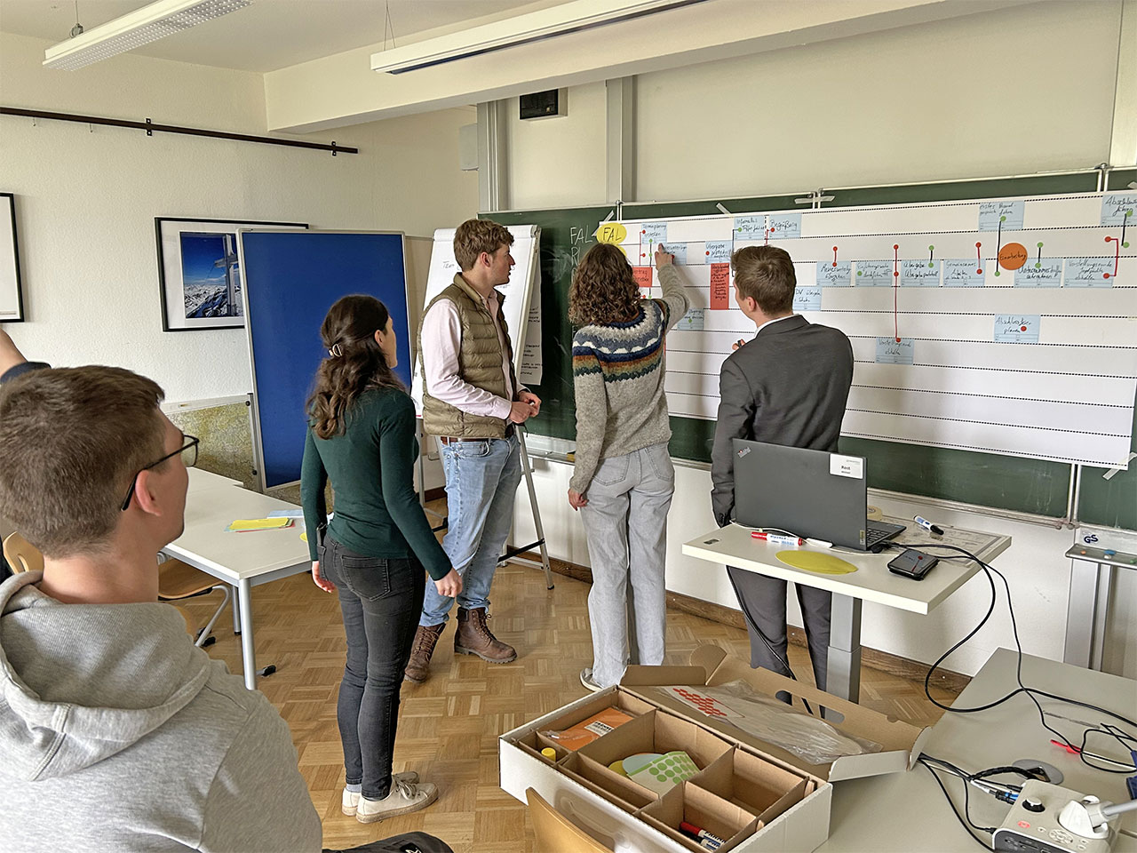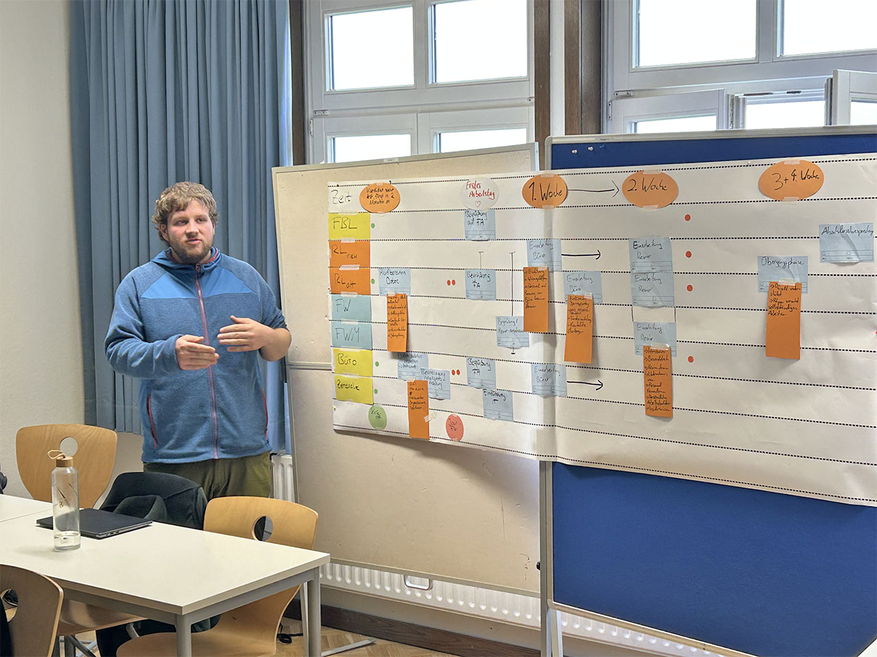 Im zweiten Teil stand die praktische Anwendung im Mittelpunkt. In Kleingruppen entwickelten die Studierenden einen Soll-Prozess für eine Revierübergabe aus der Perspektive eines forstlichen Betriebsleiters. Mithilfe eines „Schwimmbahn-Diagramms“ wurden Verantwortlichkeiten, Abläufe und Schnittstellen systematisch entwickelt. Die Übung stärkte das prozessorientierte Denken und ermöglichte es, die zuvor vermittelten theoretischen Inhalte direkt anzuwenden.