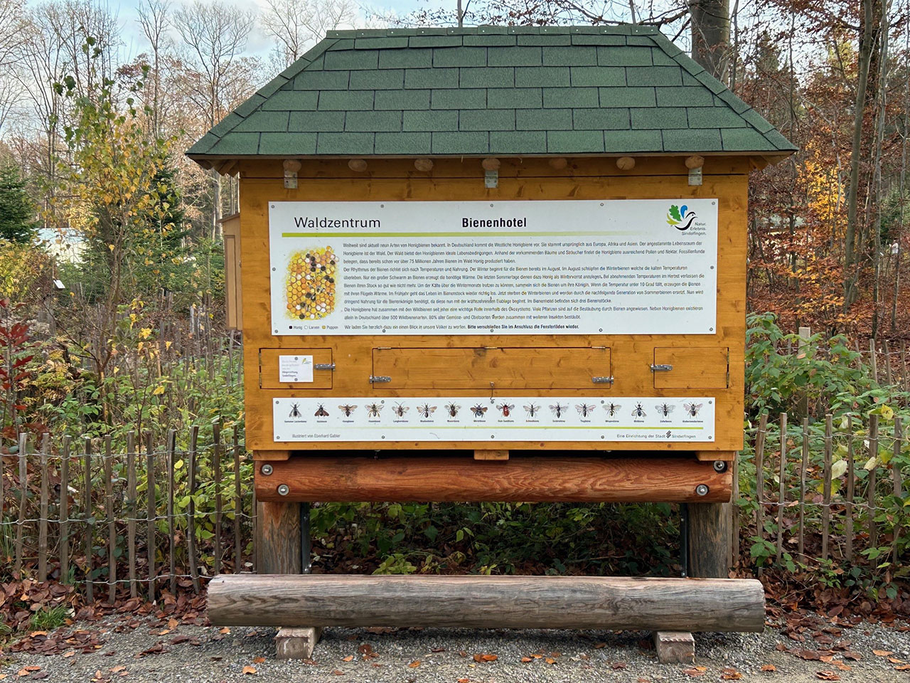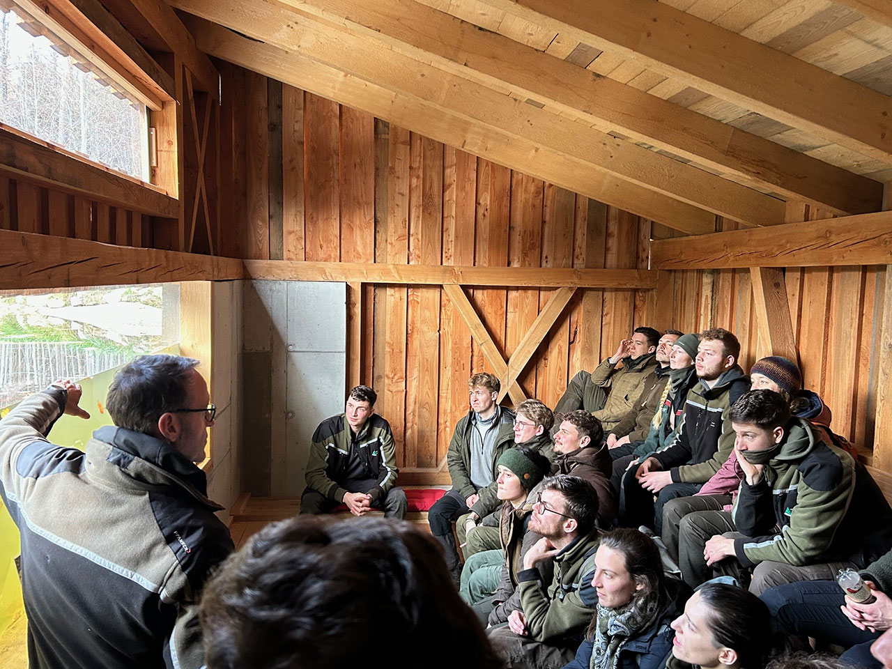 Nach diesem spannenden Einblick ging es weiter in den Forstbetrieb der Stadt Sindelfingen. Im Waldzentrum Sindelfingen stellte der städtische „Waldmeister“ Markus Klas den Betrieb und die Umweltbildungsangebote des Waldzentrums vor. Neben klassischen forstlichen Projekten, zum Beispiel einer Christbaum-Plantage, einem kleinen Sägewerk und einem anlaufenden Damwild-Gatter-Projekt, führte er auch Einrichtungen zur Umweltbildung für die urbane Bevölkerung vor. Für die Forststudenten ein wertvoller Einblick in die praktische Umsetzung der Aufgabe „Umweltbildung“. Die Wahrnehmung dieser Aufgabe ist äußerst wichtig, um ein gegenseitiges Verständnis für die jeweiligen Bedürfnisse, Sorgen und Ansichten rund um die Natur zwischen Bevölkerung und die Forstwirtschaft zu entwickeln. So betreibt das Waldzentrum unter anderem eine Vogel-Beobachtungsstation samt Fütterung, ein Bienenhotel, in welchem man die Bienen im Sommer bei der Arbeit beobachten kann, sowie ein Teichkino, in welchem Fische, Insekten und alles andere, was ein Gewässer zu bieten hat, beobachtet werden können.