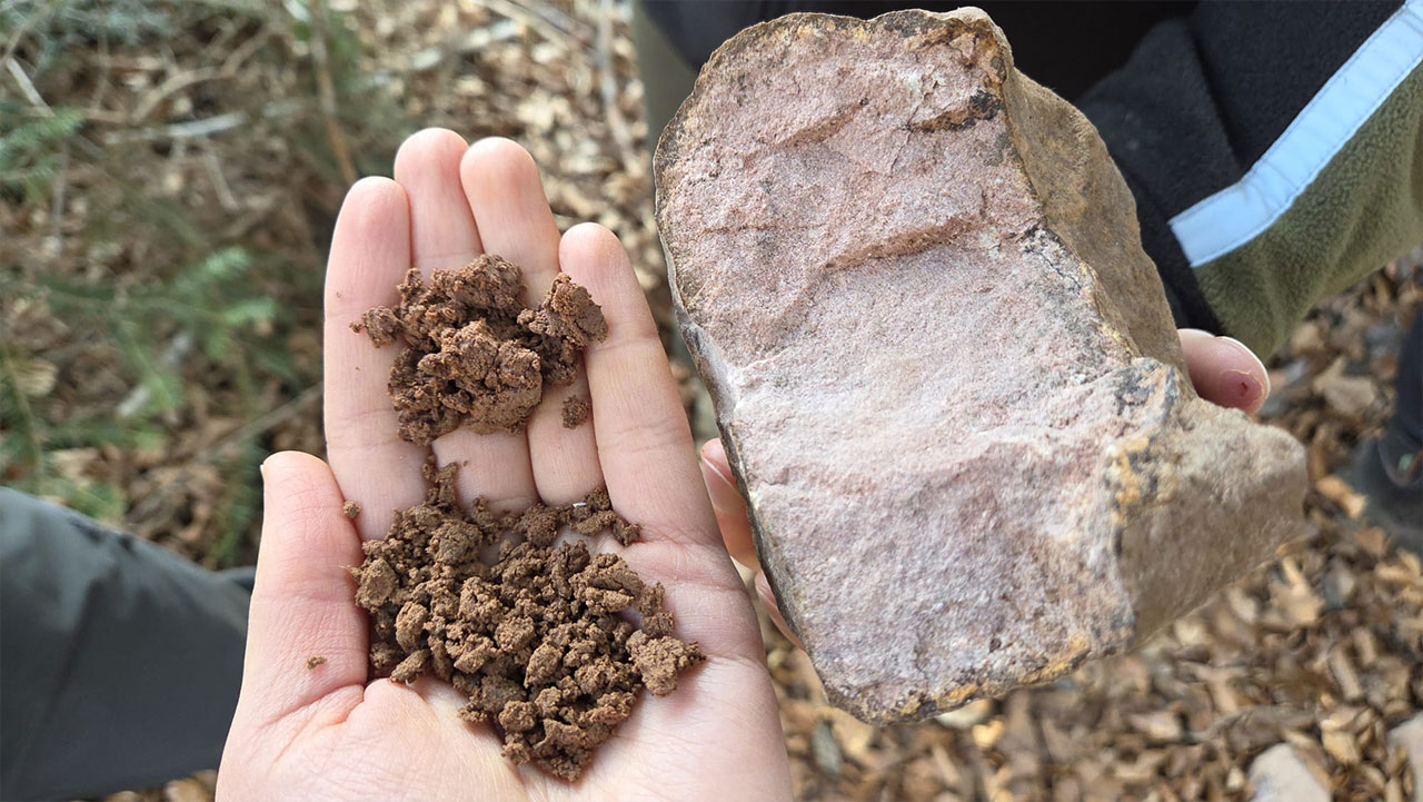 Um die Messdaten auch in den Kontext des Standorts zu setzen, wurde auf der Exkursion auch ein Bodenprofil der Messfläche betrachtet. Anhand eines aufgeschlossenen Profils kann man die verschiedenen Horizonte eines Bodens erkennen. Der vorliegende Bodentyp zeigte Merkmale einer Pseudogley-Braunerde, bei der Staunässe im Unterboden eine wichtige Rolle spielt. Die Standortbedingungen haben unmittelbare Auswirkungen auf die Wasserverfügbarkeit, die Durchlüftung des Bodens und damit letztlich auf das Wachstum der Bäume.